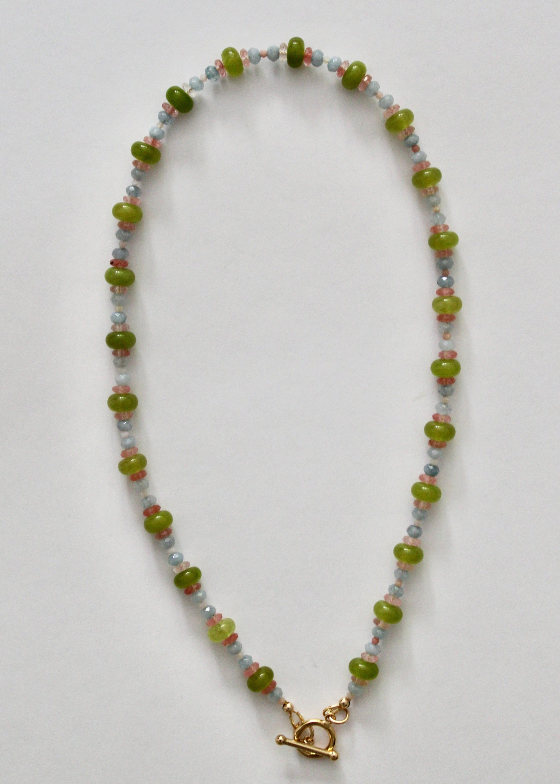 Gemstones: Rose Quartz, Pink Opal, Aquamarine, and Olive Jade sourced in Paris this summer!