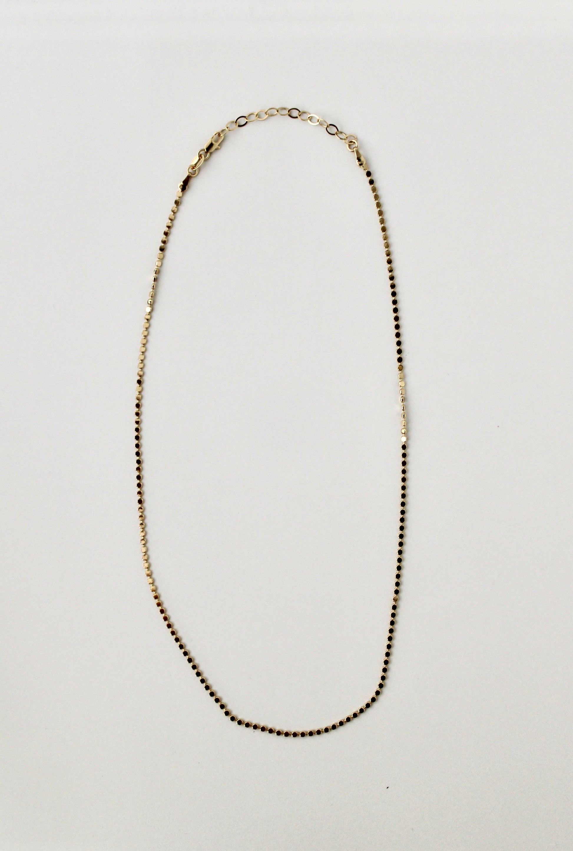 Meet your new favorite layer: a necklace with flat dots that shimmer just so, giving off that understated sparkle. A modern take on the classic gold bead—sleek, refined, and a little mysterious. Maybe it’s Morse code, maybe it’s just chic perfection.