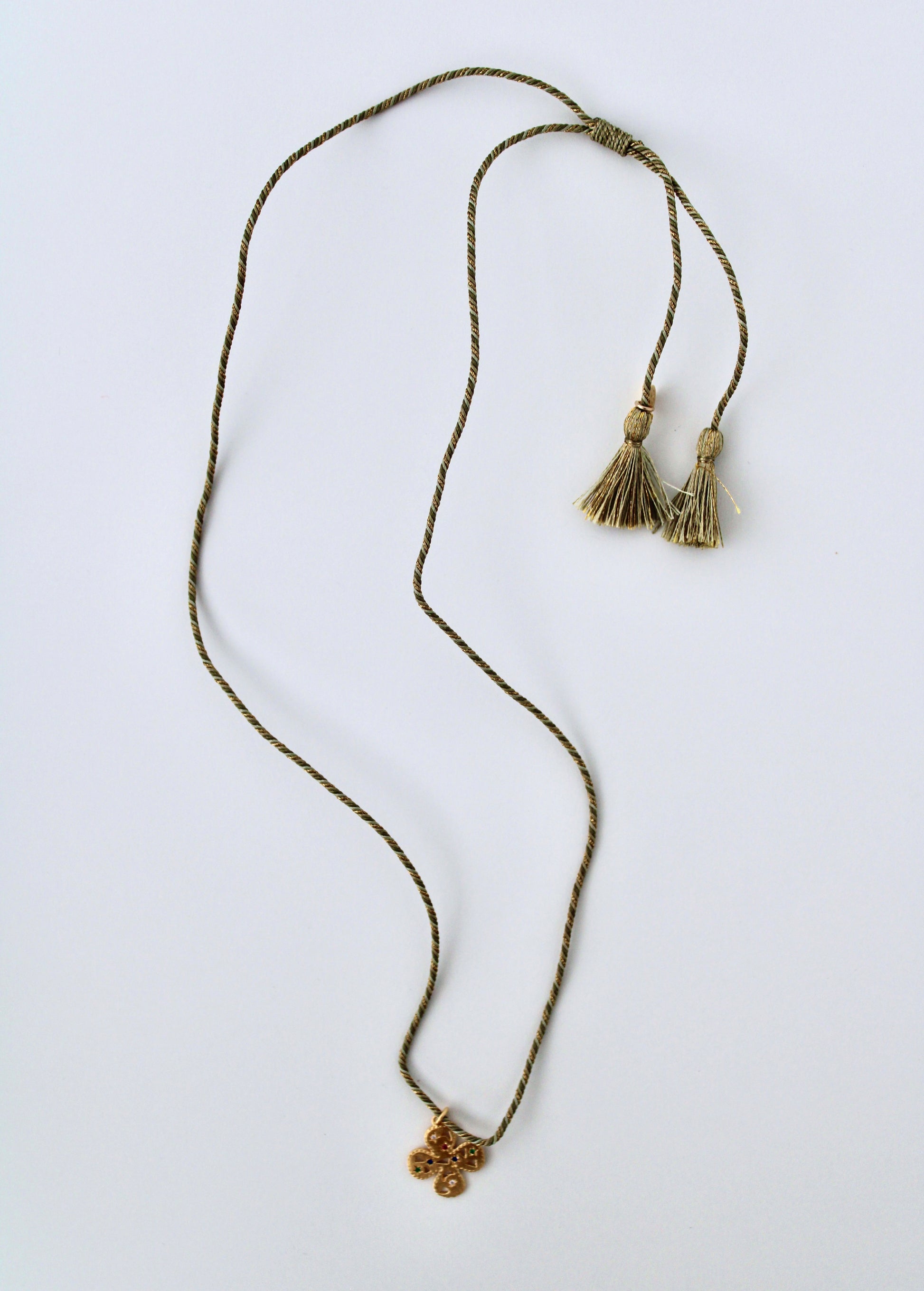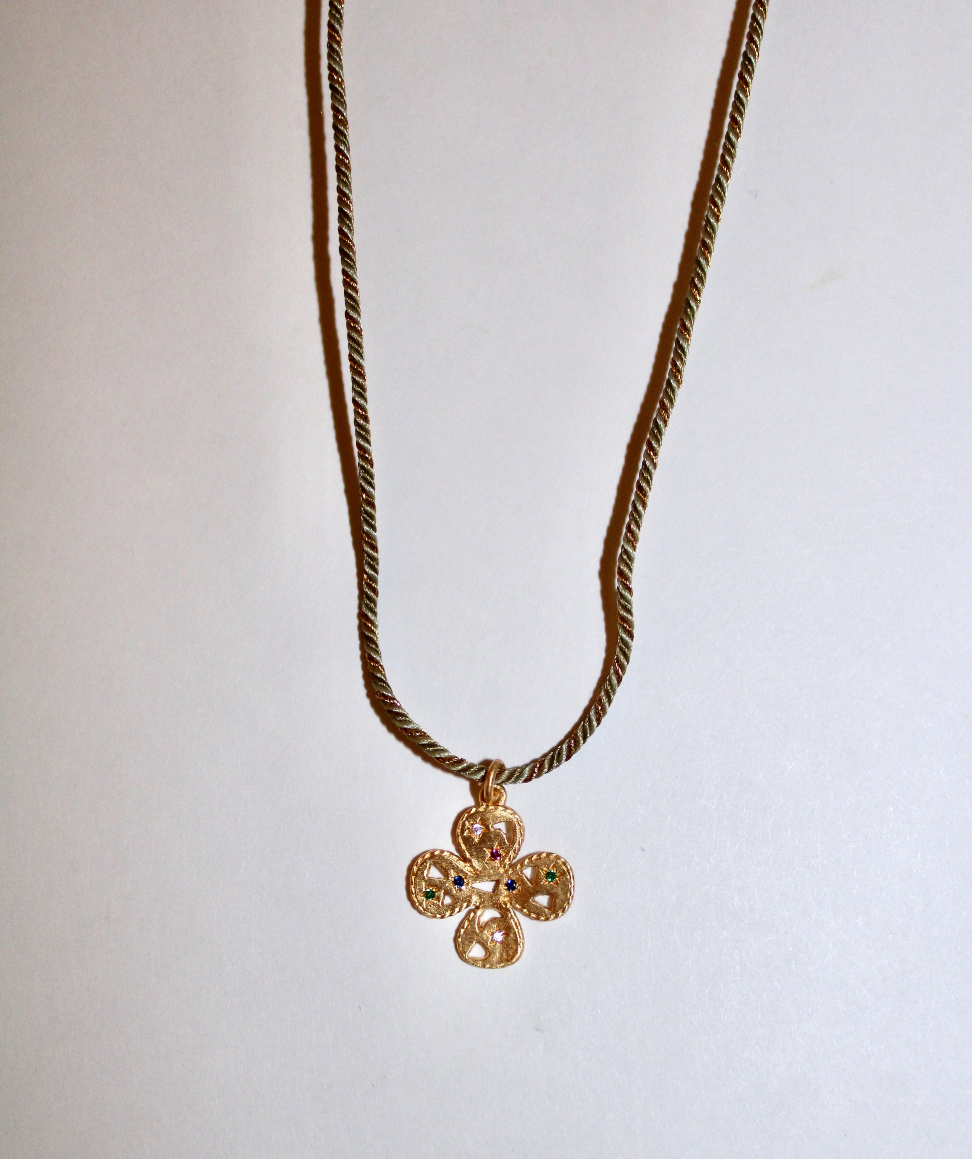 This little clover isn’t just lucky- it’s French, which basically means it’s luck with better taste. Gemstone-speckled and strung on luxe cord, it’s got just enough sparkle to feel fancy, but it still plays nice with your cutoffs and Aperol spritz. Your jewelry box called, and it wants this necklace.